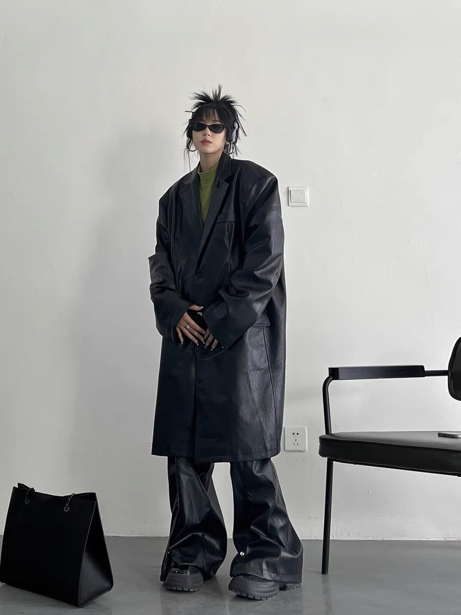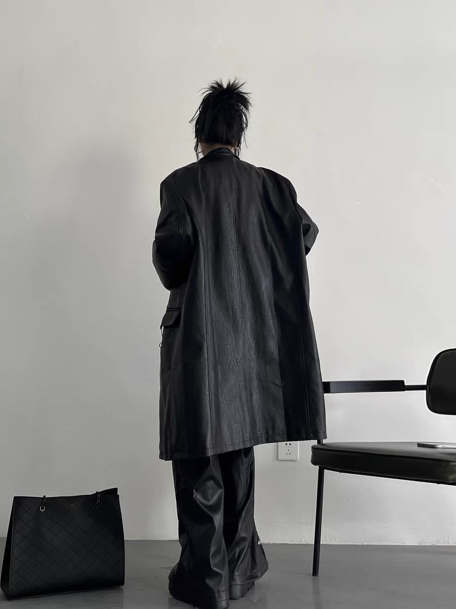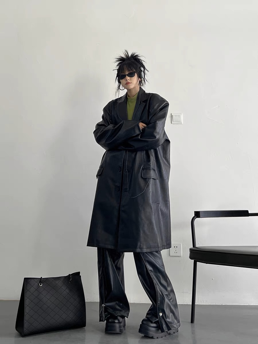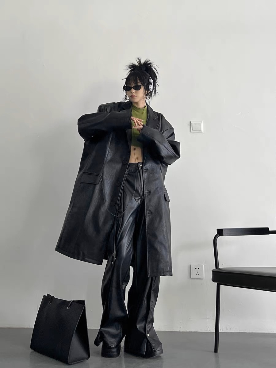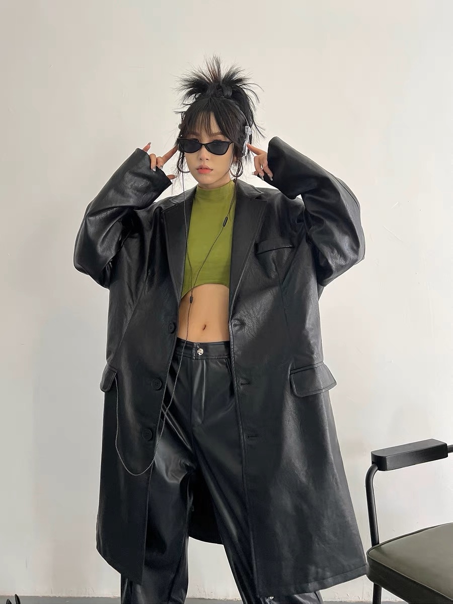 韓國pu皮質長版西裝外套