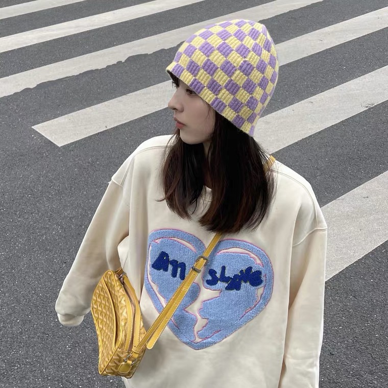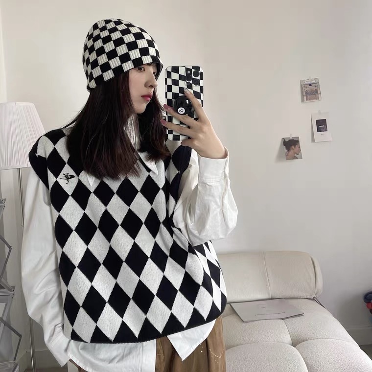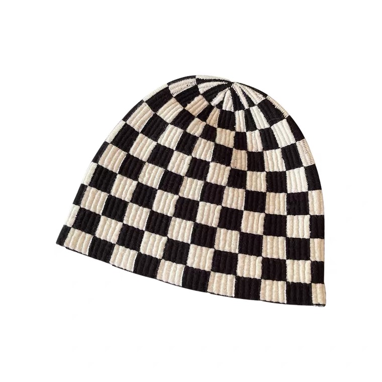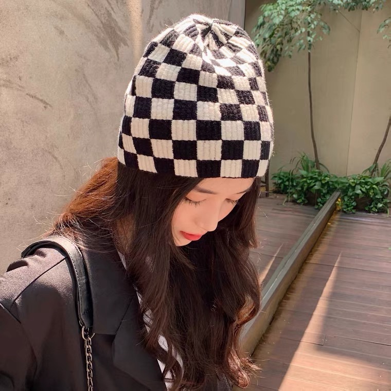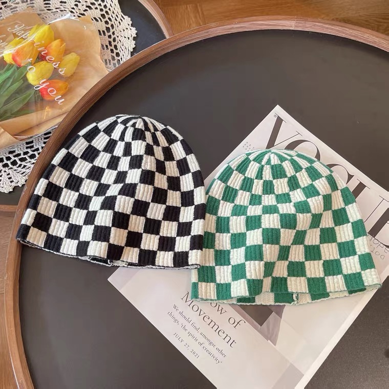 韓國棋盤格針織毛帽